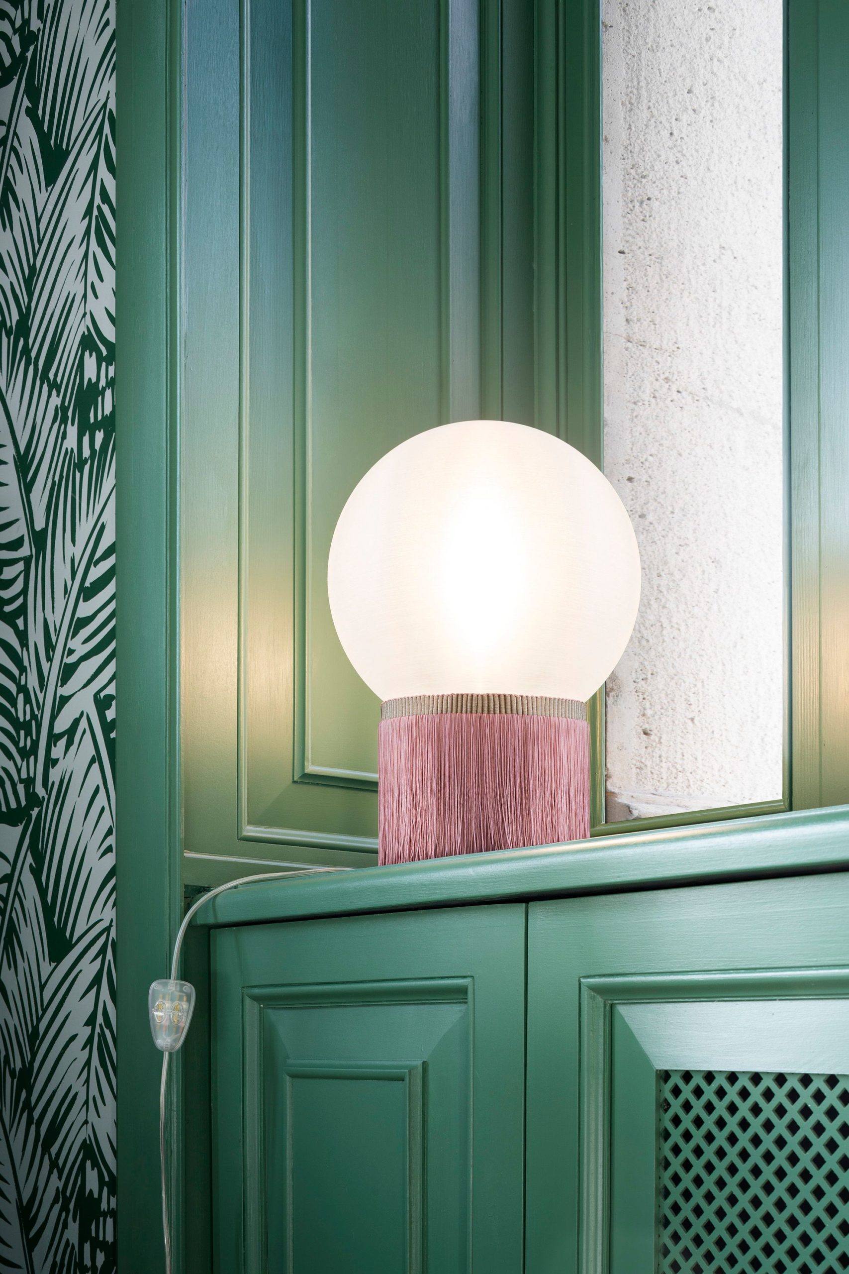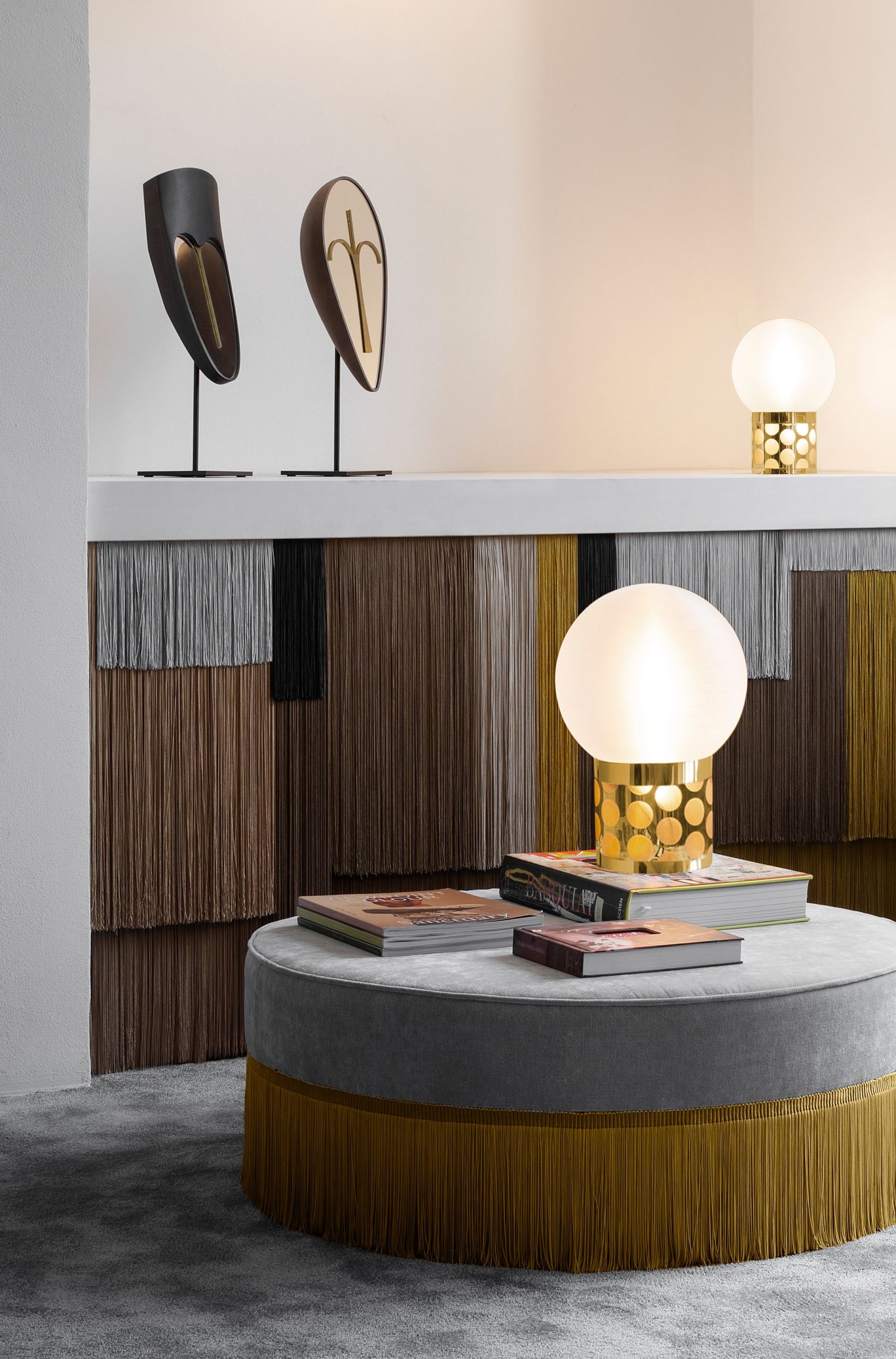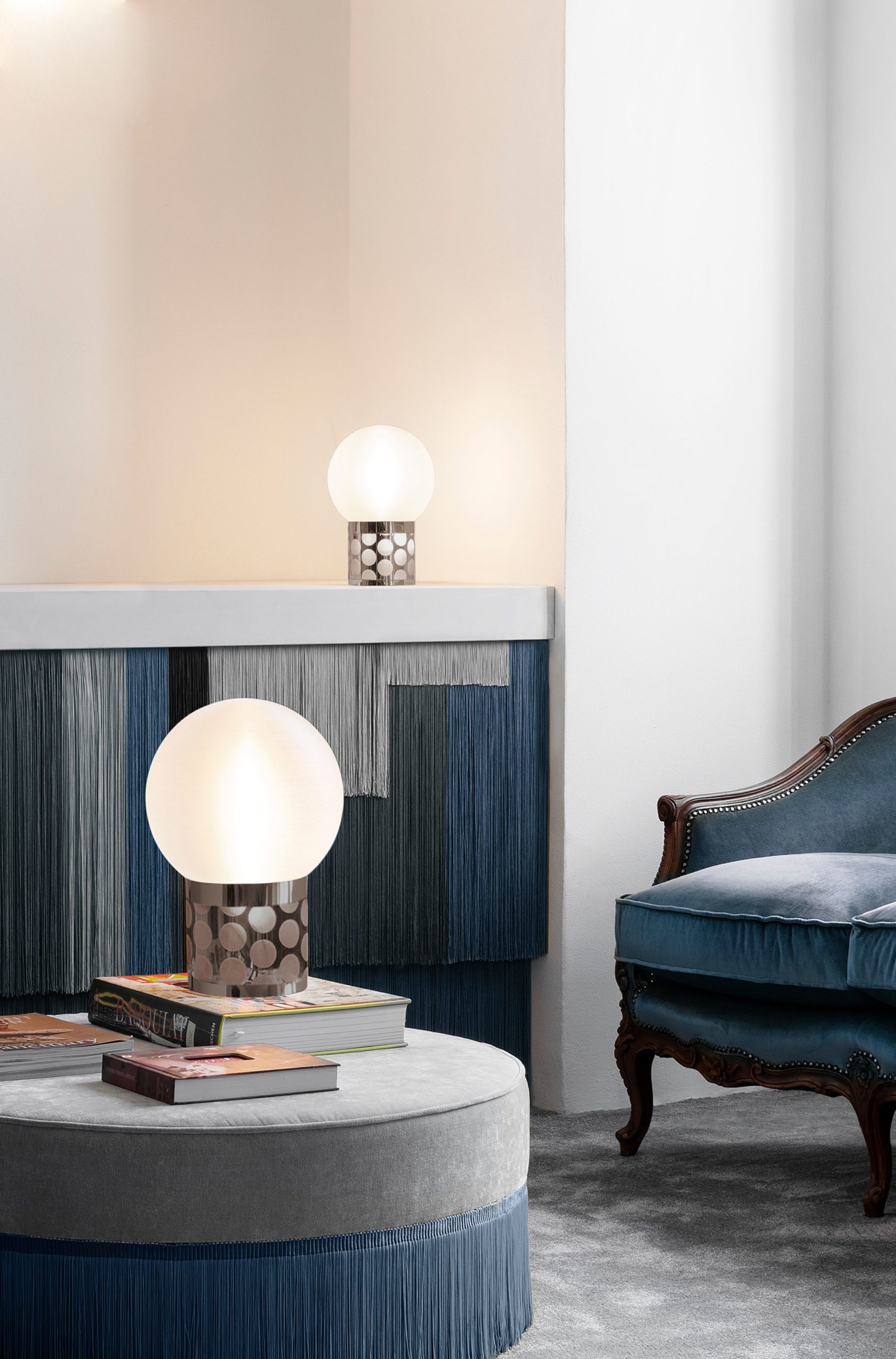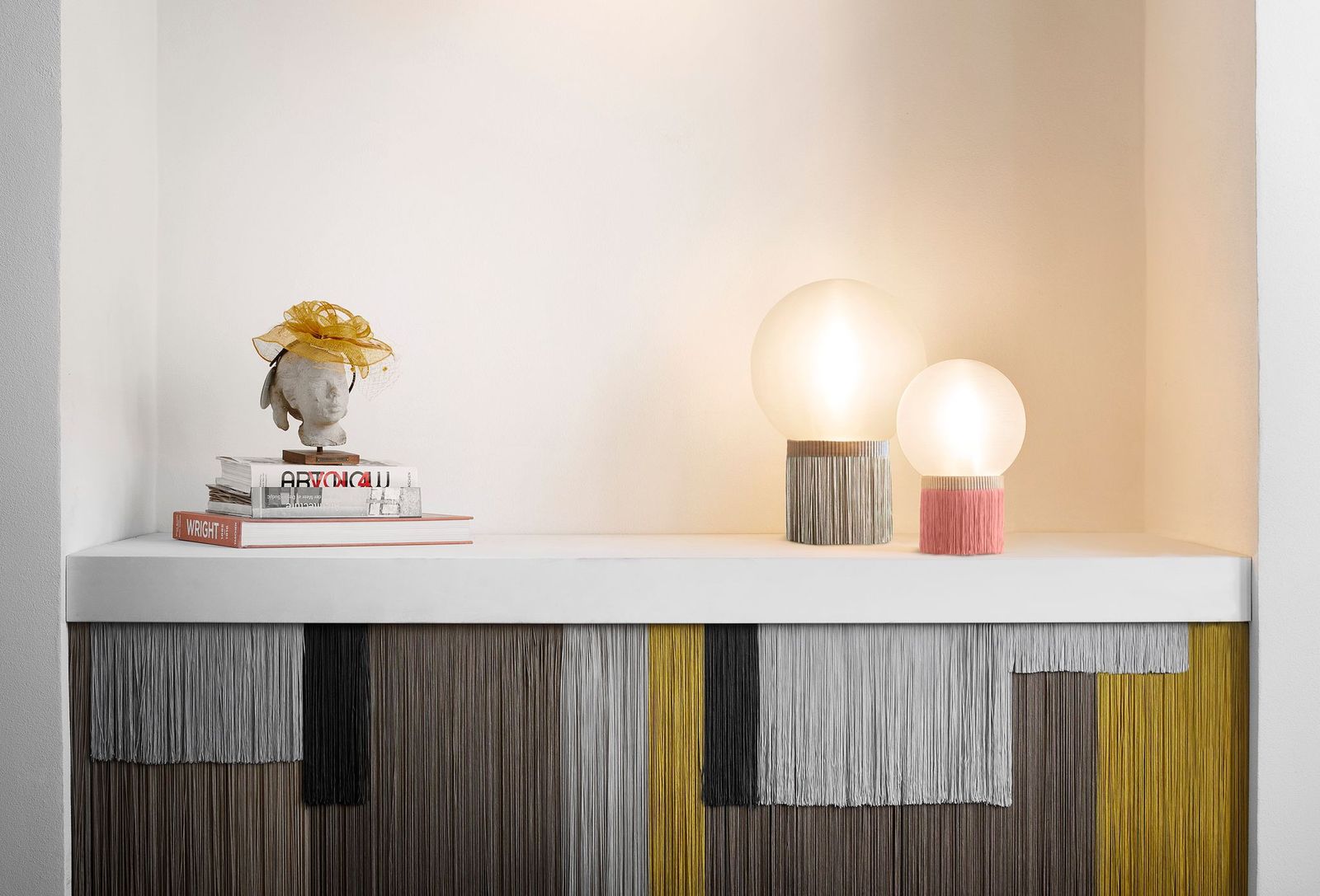Η Atmosfera βρίσκεται στην κορυφή της μόδας και του σχεδιασμού, όπου το φως συγχωνεύεται με το ύφασμα. Η νέα συλλογή επιτραπέζιων φωτιστικών διατίθεται σε 2 μεγέθη, με ροζ ή γκρι κροσέ σε στυλ Τσάρλεστον ή μεταλλική έκδοση όπου τα υπέρθετα στρώματα τεχνοπολυμερούς δημιουργούν ένα εφέ polkadot. Τα φωτιστικά έχουν ανεξάρτητους διακόπτες στη σφαίρα και τη βάση, το διακριτικό φως είναι ιδανικό για επιστροφή αργά το βράδυ στο σπίτι. Διατίθεται επίσης σε λάμπα ανάρτησης.