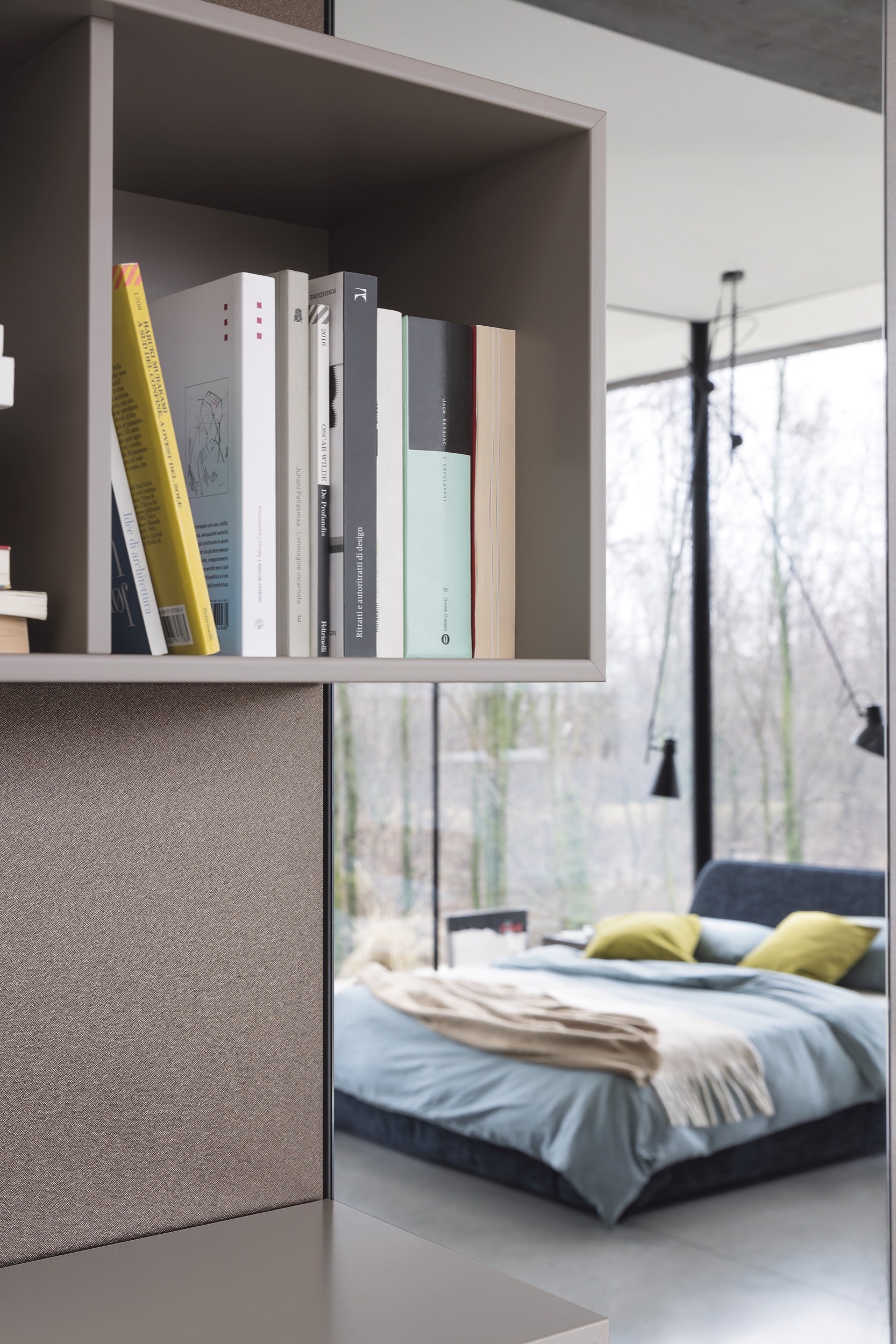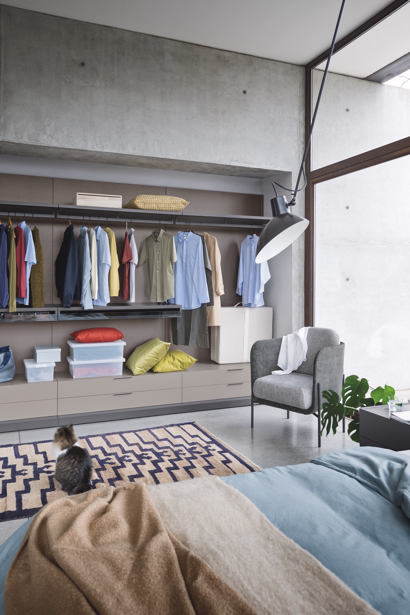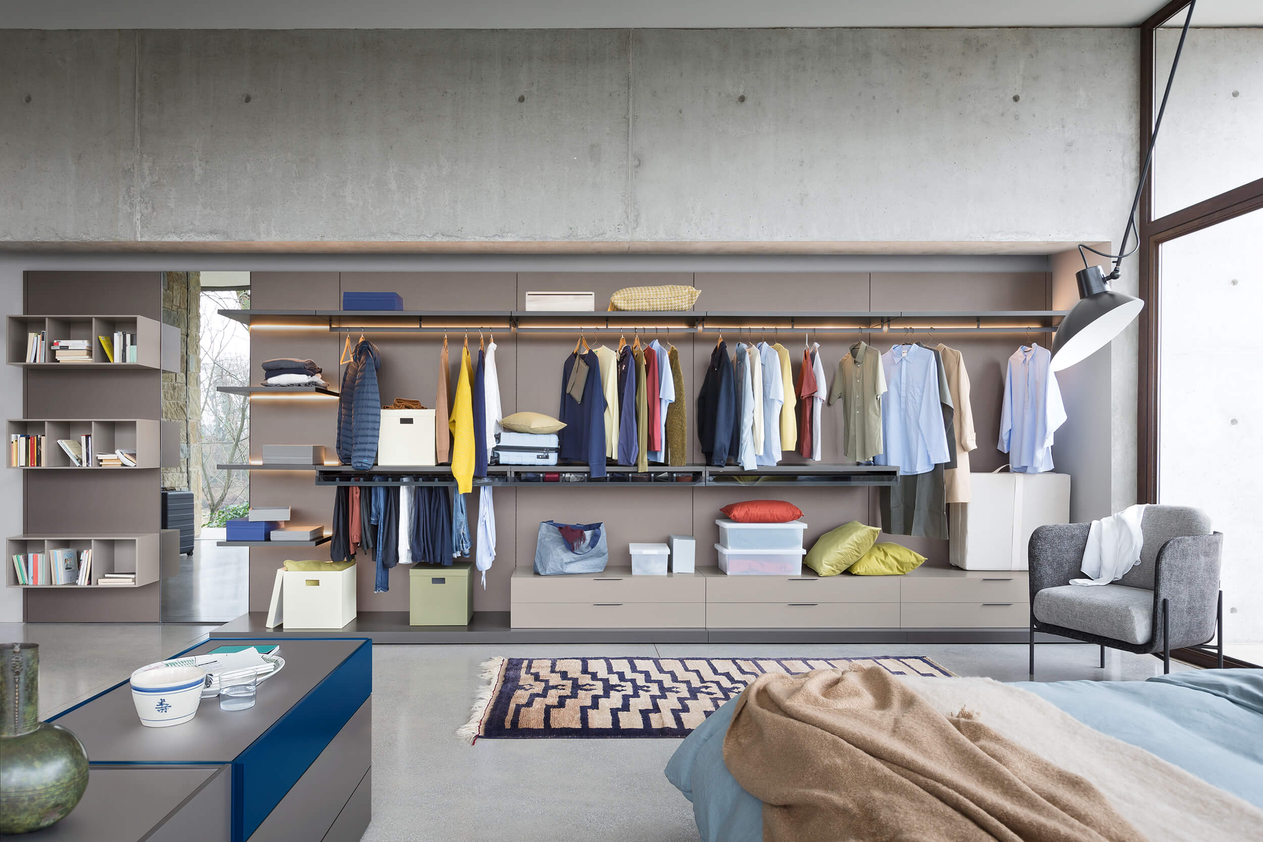 Ευρύχωρο, λειτουργικό και συναρμολογίσμο, το δωμάτιο-ντουλάπα Break μπορεί να εξοπλιστεί με γωνιακές μονάδες, φωτισμό LED στο πίσω μέρος των ραφιών, συρτάρια καπνιστού γυαλιού, κρεμαστά κιγκλιδώματα και αξεσουάρ σε χάλκινο φινίρισμα. Το σύστημα σιδηροτροχιάς με σχισμές καταργεί την ανάγκη για στήριξη πλευρικών πλαισίων και ως εκ τούτου δίνει οπτικά ελαφριά εμφάνιση.