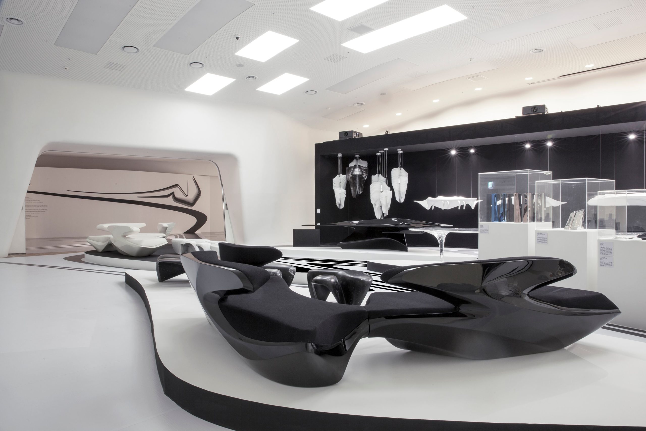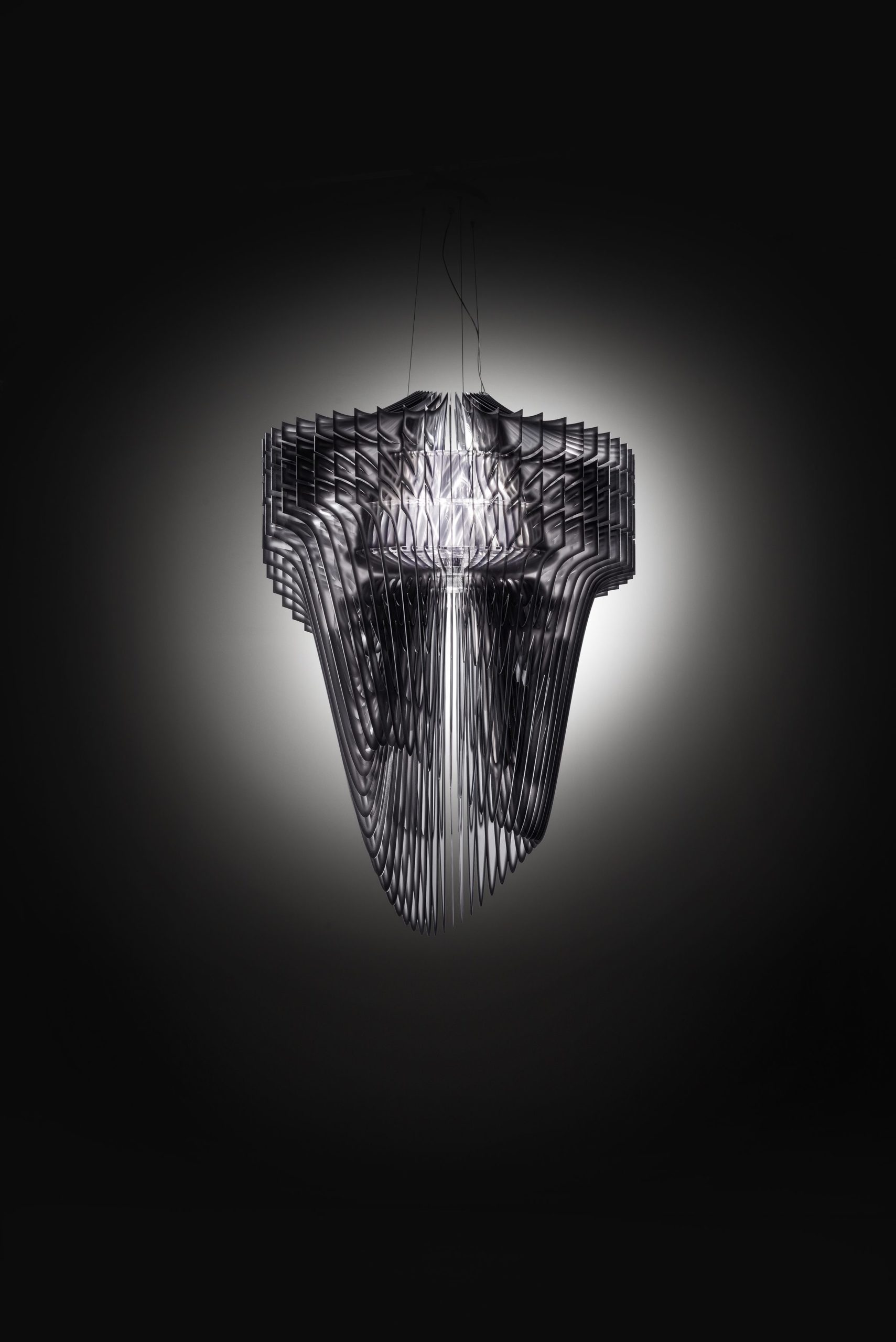 Zaha Hadid’s luminous architecture is visionary, fluid and dynamic, infusing the revolutionary and iconic semantics of the celebrated architect into domestic and public interiors; the result is the harmonization of beings and their surrounding spaces. From the new metallized Gold (50, 60 and 70 cm), the original version with shaded black edges (Ø90 cm), to the ethereal transparent, polycarbonate versions, Hadid’s masterpieces consist of 50 “arms”, each diverse from the others, radiating around a voluminous LED source.