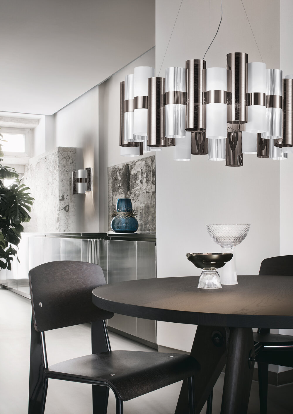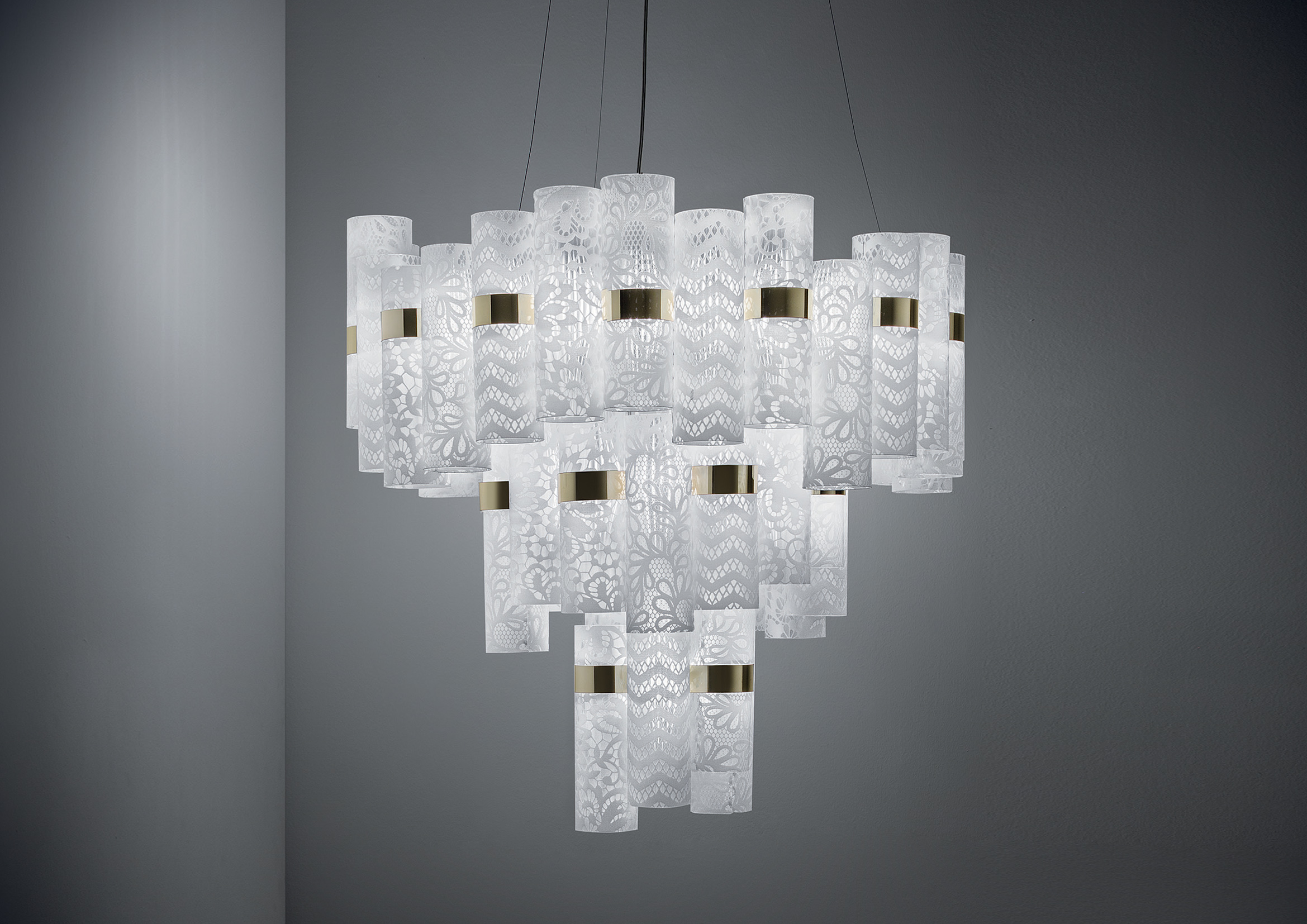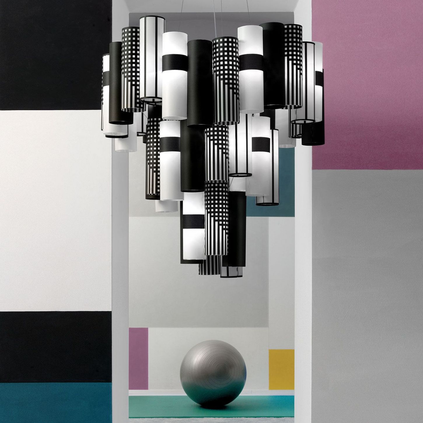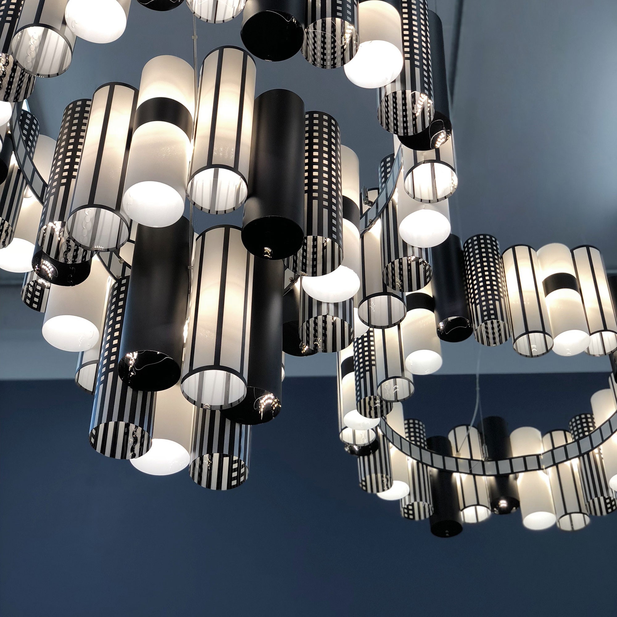 La Lollo is a tribute to the roaring 50’s, a series of graceful suspensions that reawaken images of divas in the spotlight. The techno-polymer cylinders, in varying shades of contemporary prismatic metallization and geometric patterns, alternate around a central, illuminated ring. The collection includes 2 sizes, as well as an opulent chandelier, all designed for public or domestic spaces, or to be combined in dramatic installations.