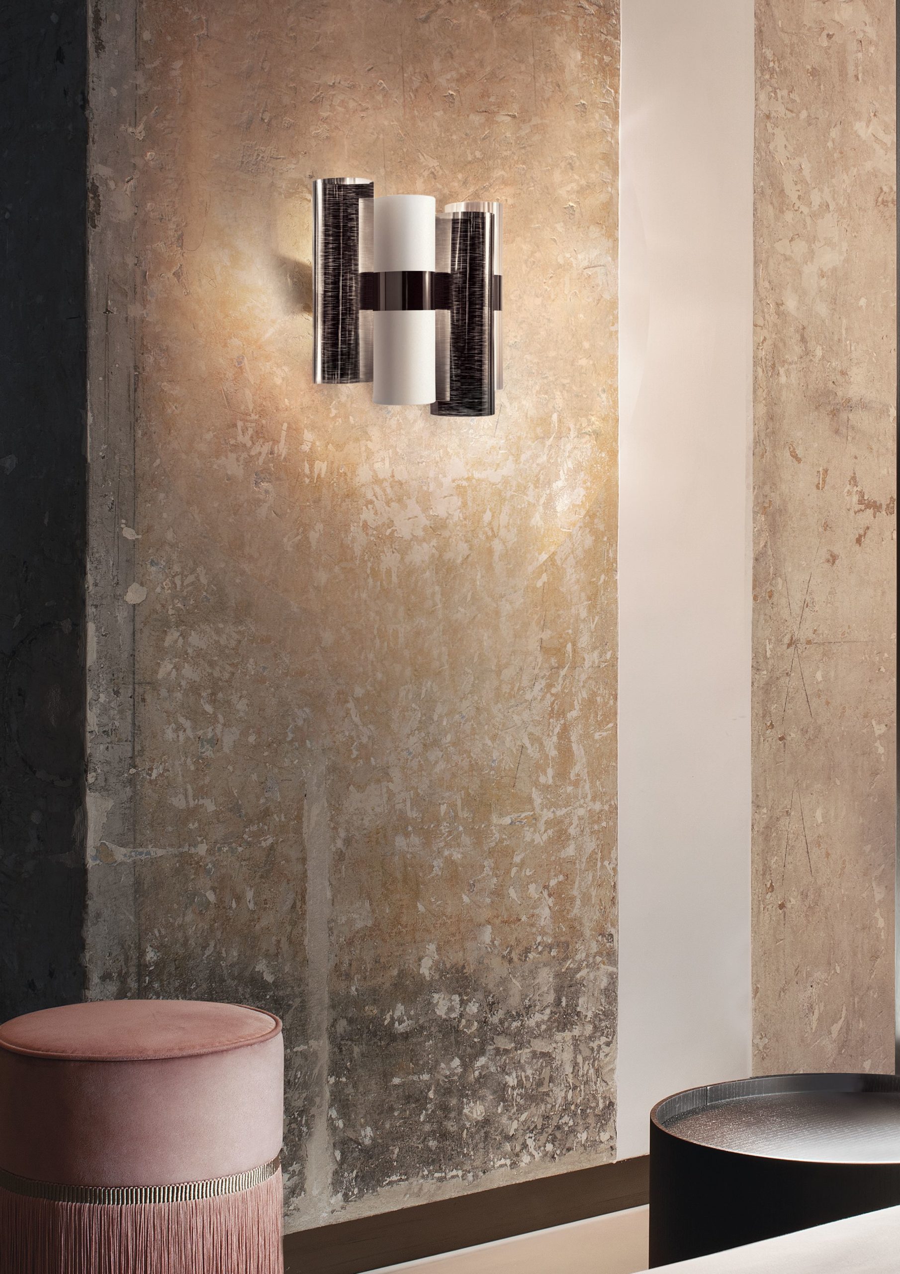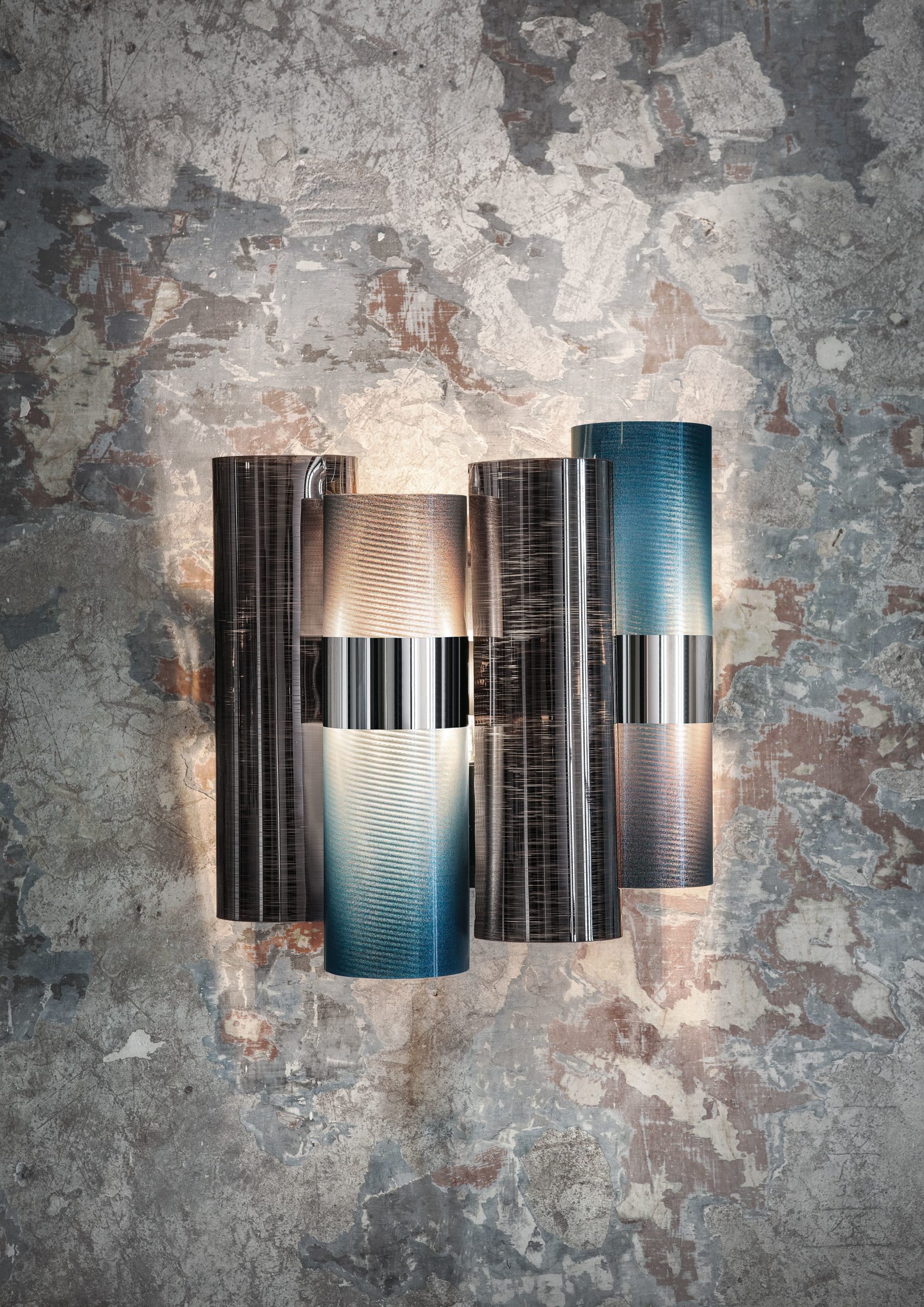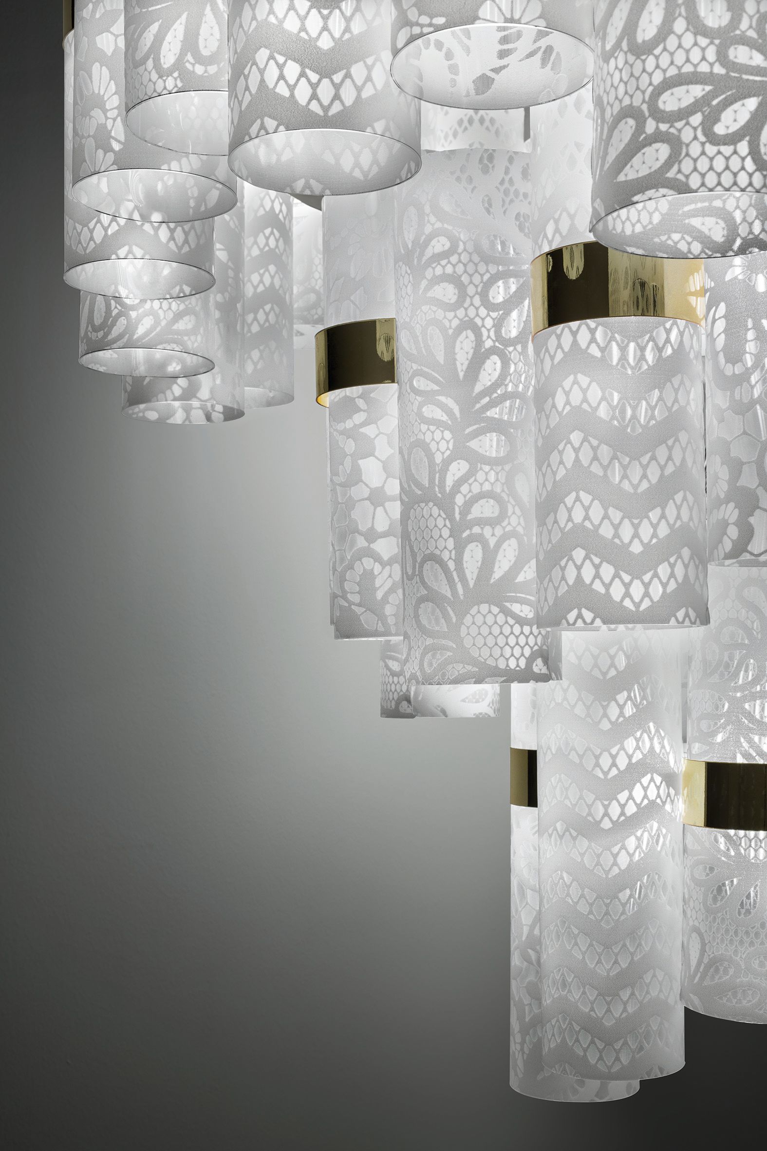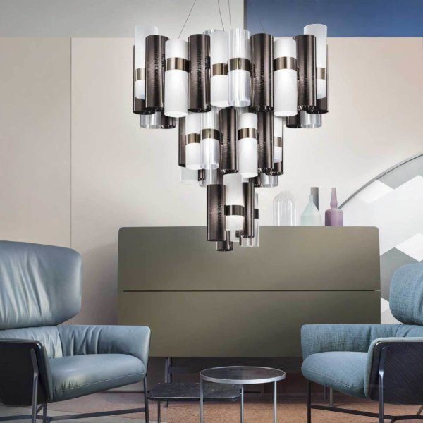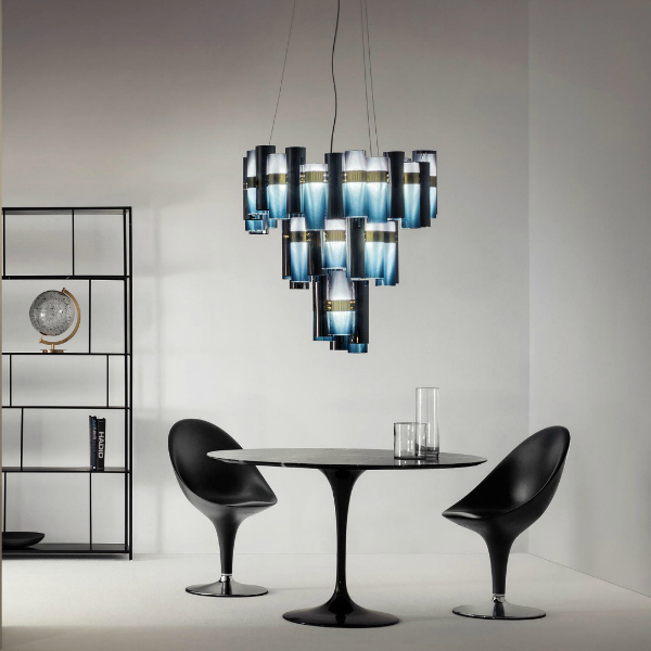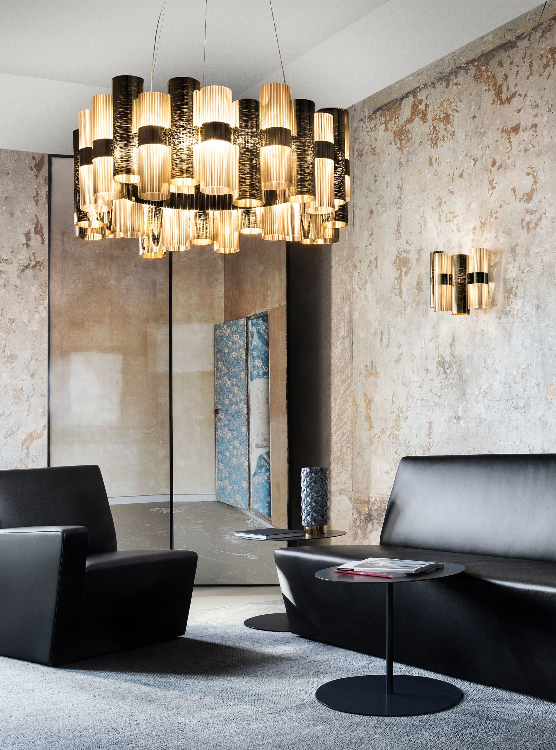 La Lollo is a tribute to the roaring 50’s, a series of graceful suspensions that reawaken images of divas in the spotlight. The techno-polymer cylinders, in varying shades of contemporary prismatic metallization and geometric patterns, alternate around a central, illuminated ring. The collection includes 2 sizes, as well as an opulent chandelier, all designed for public or domestic spaces, or to be combined in dramatic installations.