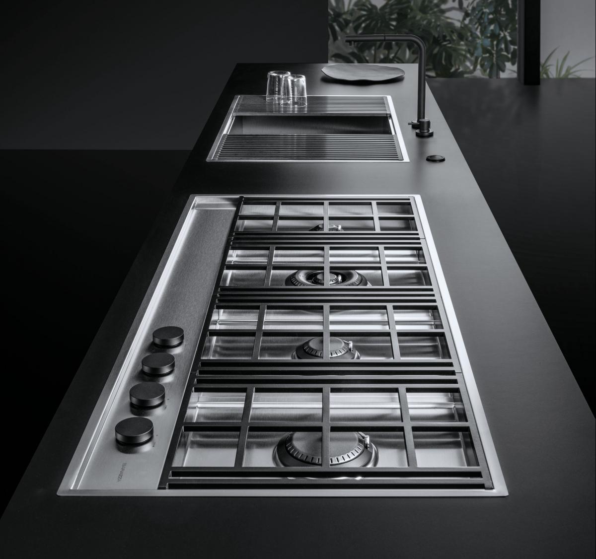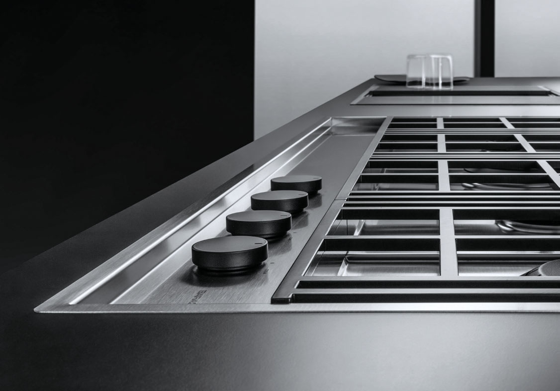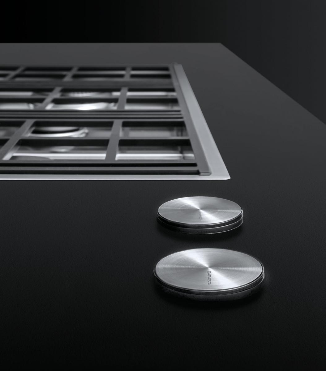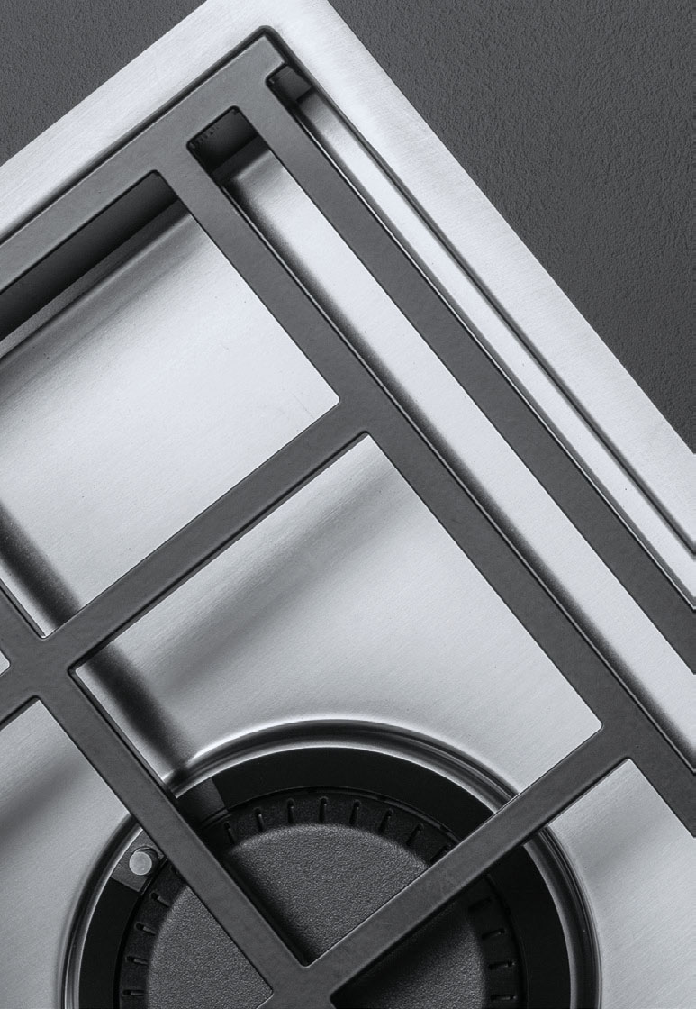 Modularity and flexibility merge with a pure and essential style that runs the length of the surface, perfectly in line with the worktop. The strong personality of Lab is taken to a new level with the Lab Evolution hobs: wider depth, Flat Eco-Design burners and pan supports in Soft-Touch cast iron.