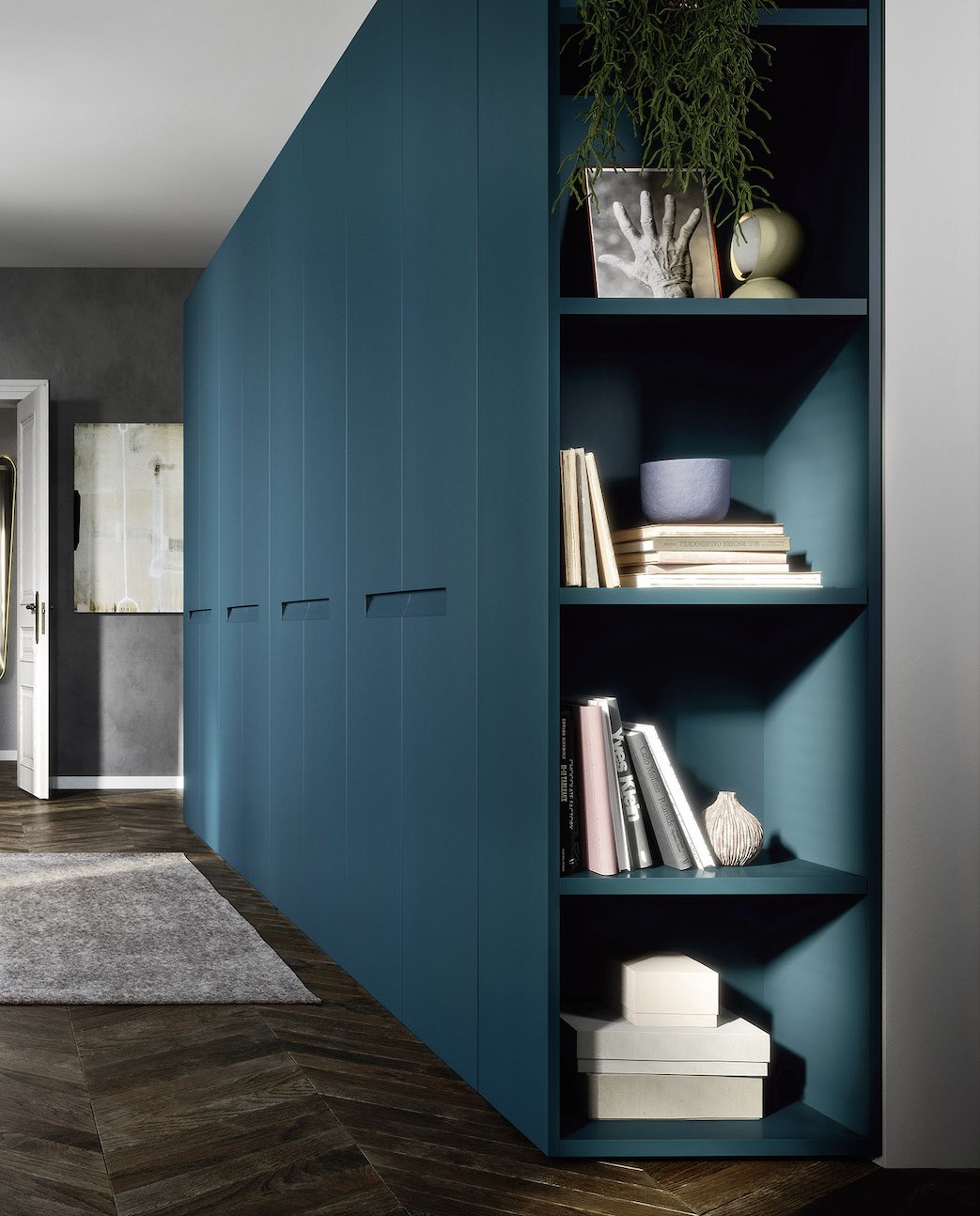 The generous mass of the Liberty hinged door wardrobe - in a matt lacquered finish - is punctuated by the distinctive slanted cut of the handle carved into the door. The wardrobe can be recessed or set against a wall.