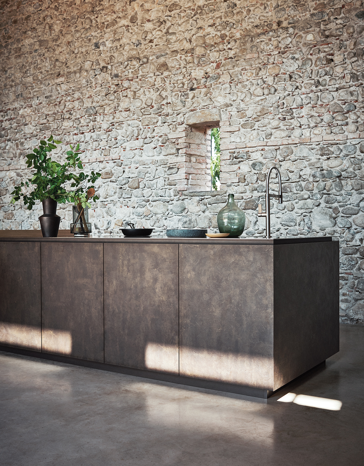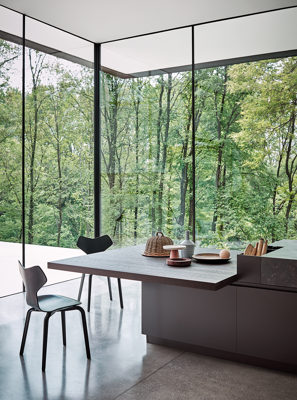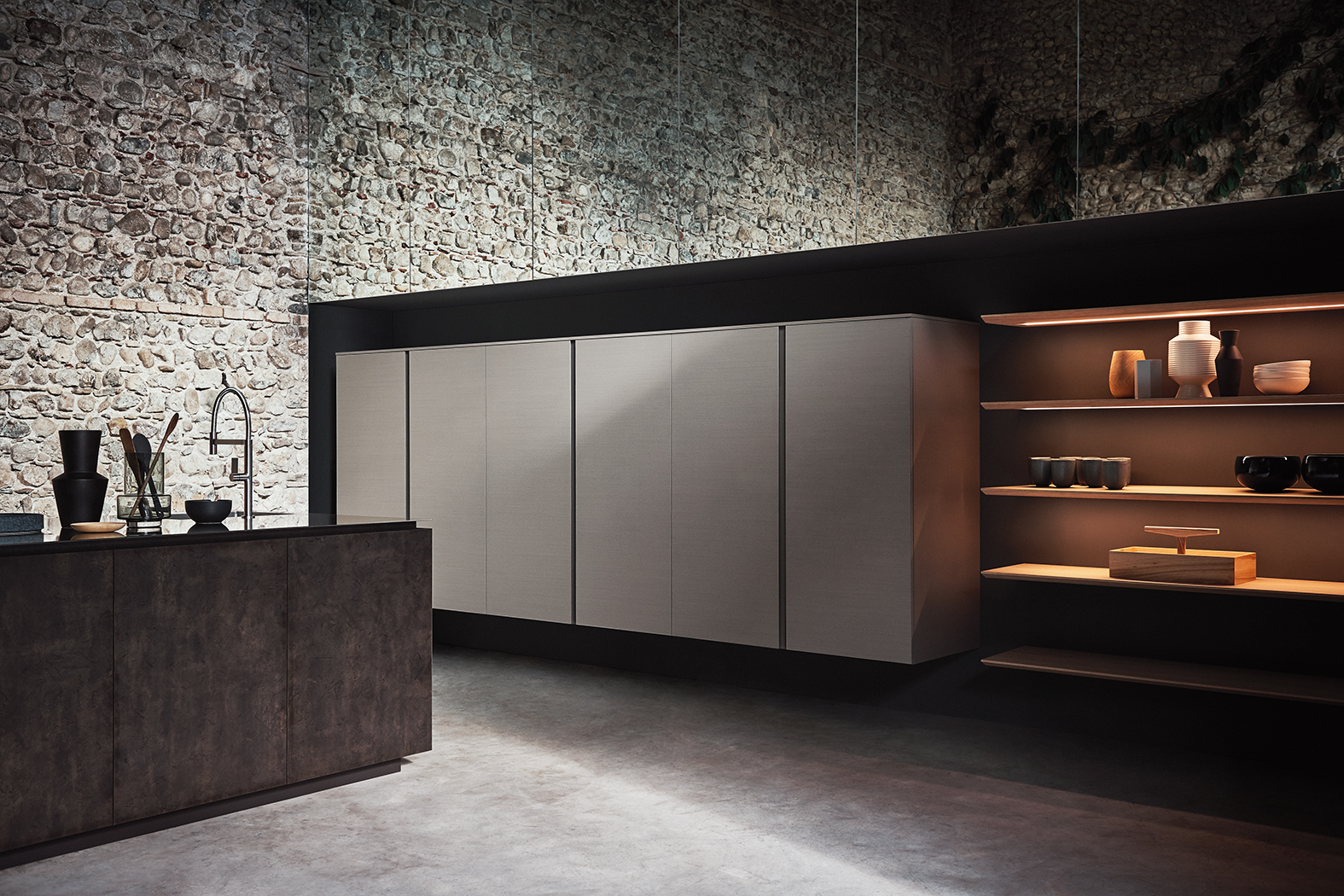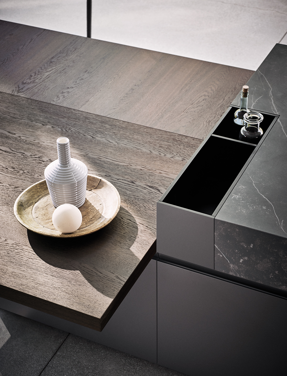 The worktop’s textured Dekton Kelya finish gives this arrangement a distinctive and refined appeal while setting off the colour scheme of the whole project and highlighting the very different thicknesses of the top. Additional open storage is offered by fitting the Trilli units in the top which adds variety to the layout and to the material pairings.