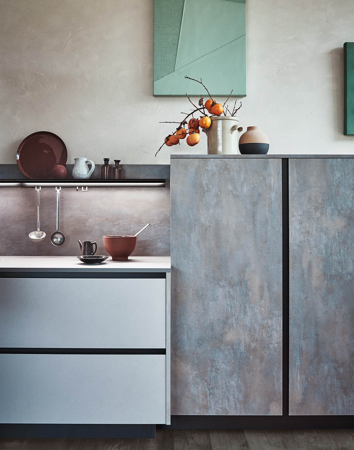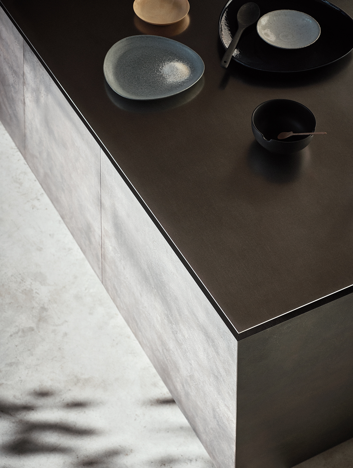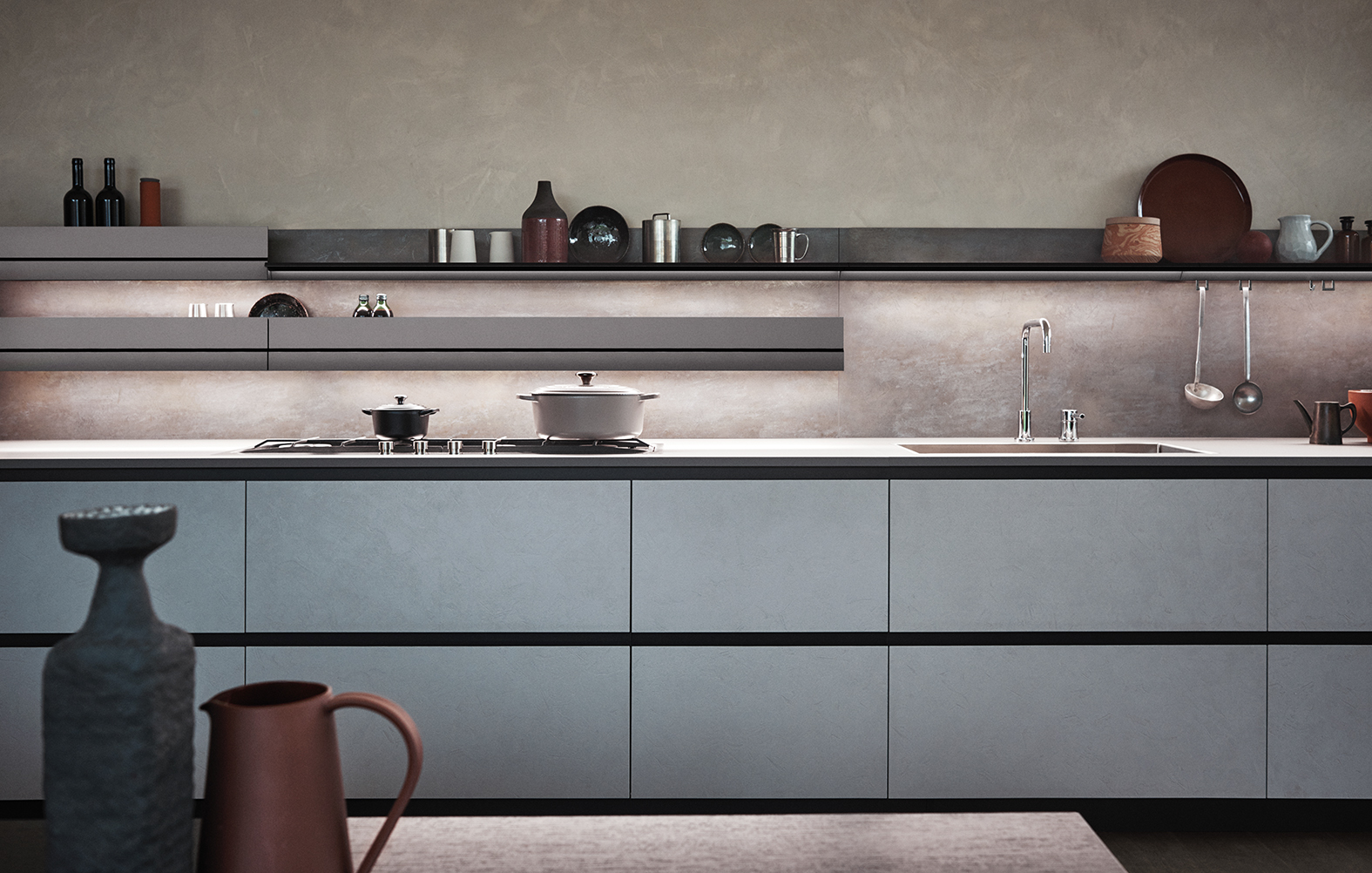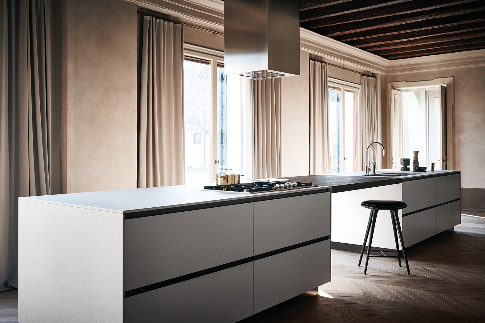 The worktop’s textured Dekton Kelya finish gives this arrangement a distinctive and refined appeal while setting off the colour scheme of the whole project and highlighting the very different thicknesses of the top. Additional open storage is offered by fitting the Trilli units in the top which adds variety to the layout and to the material pairings.