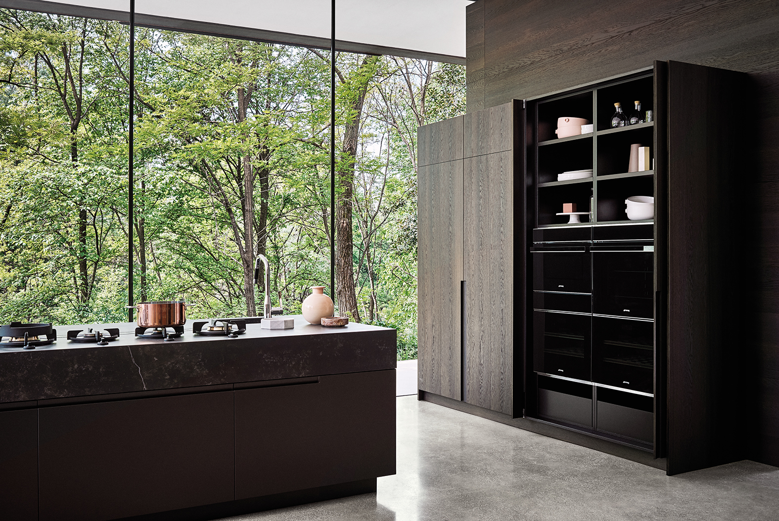 Doors with “Inside” grip edgings in silk-effect Titanio lacquer. Dekton Kelya worktop. Breakfast bar: Rovere Termocotto. Tall kitchen units: retracting doors, in Rovere Termocotto. Living room arrangement: Rovere Termocotto doors, Dekton Kelya open compartment. -